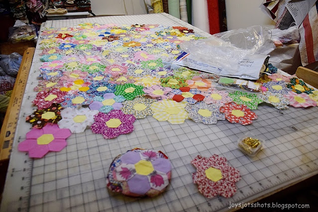 I've had blogging friends that so generously pay for postage to mail me piles and boxes of fabric, and hexie pieces for and entire quilt (see yesterday's post). Thank you Barbara and Kathy (and I think there is another?)